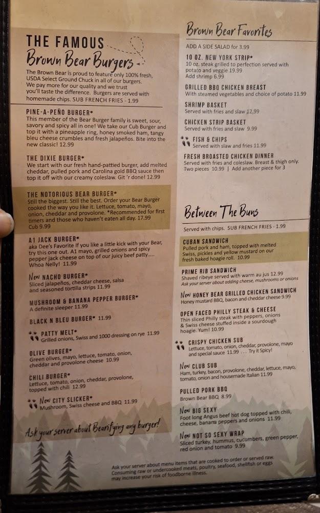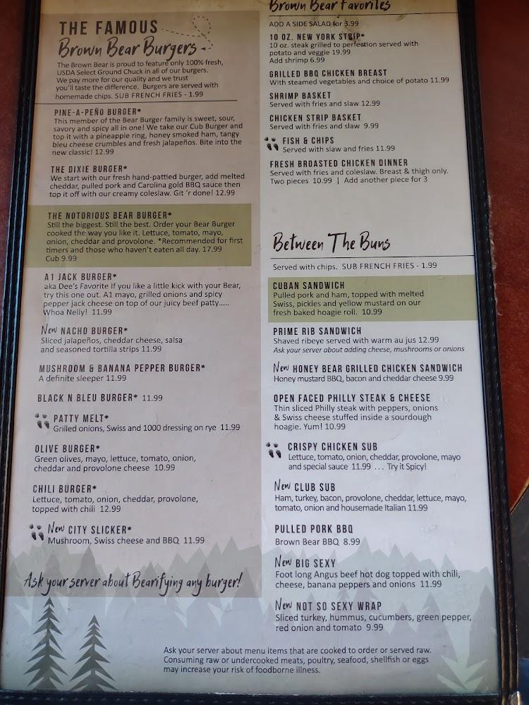 The menu at Brown Bear includes a mix of hearty options and lighter fare. Signature items feature a variety of burgers that cater to various tastes, from spicy to savory. Fans of classic comfort food can delight in fish and chips or chicken strips. Those preferring lighter options can choose from fresh salads. The “Bear-Ables” section consists of appetizers perfect for sharing, showcasing fried mushrooms and onion rings. Don't forget the desserts! The Giant Chocolate Cake is a must-try for those with a sweet tooth. Each dish reflects quality and care, making it appealing for all.